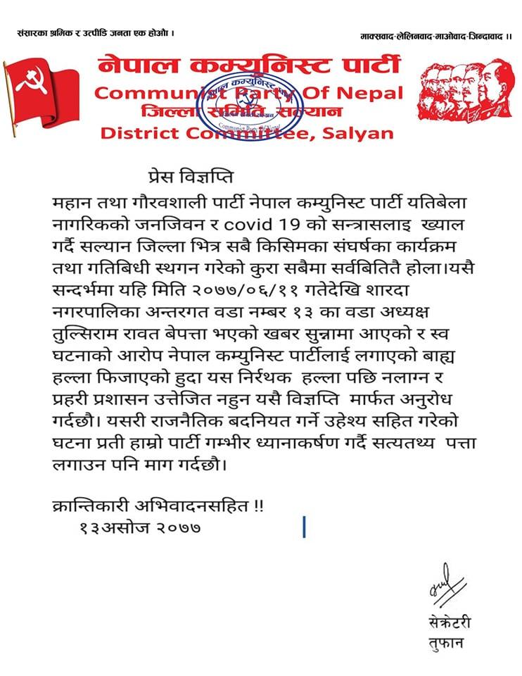 ‘महान तथा गौरवशाली पार्टी नेपाल कम्युनिष्ट पार्टी यतिवेला नागरिकको जनजिवन र कोभिड १९ को सन्त्रासलाई ख्याल गर्दै सल्यान जिल्ला भित्र सवै किसमका संघर्षका कार्यक्रक तथा गतिविधि स्थगन गरेको कुरा सवैलाई सर्वविदितै होला ।’ विज्ञप्तीमा लेखिएको छ – ‘यसै सन्दर्भमा यहि मिति २०७७-०६ -११ गते देखी शारदा नगरपालिका अन्तरगत वडा न. १३ का वडाध्यक्ष तुल्सीराम रावत बेपत्ता भएको खवर सुन्नमा आएको र सो घटनाको आरोप नेपाल कम्यनिष्ट पार्टीलाई लगाएको बाह्य हल्ला फिजाएको हुदा यस निरर्थक हल्ला पछि नलाग्न र प्रहरी प्रशासनलाई उत्तेजित नहुन यसै बिज्ञप्ती मार्फत अनुरोध गर्दछौं ।’