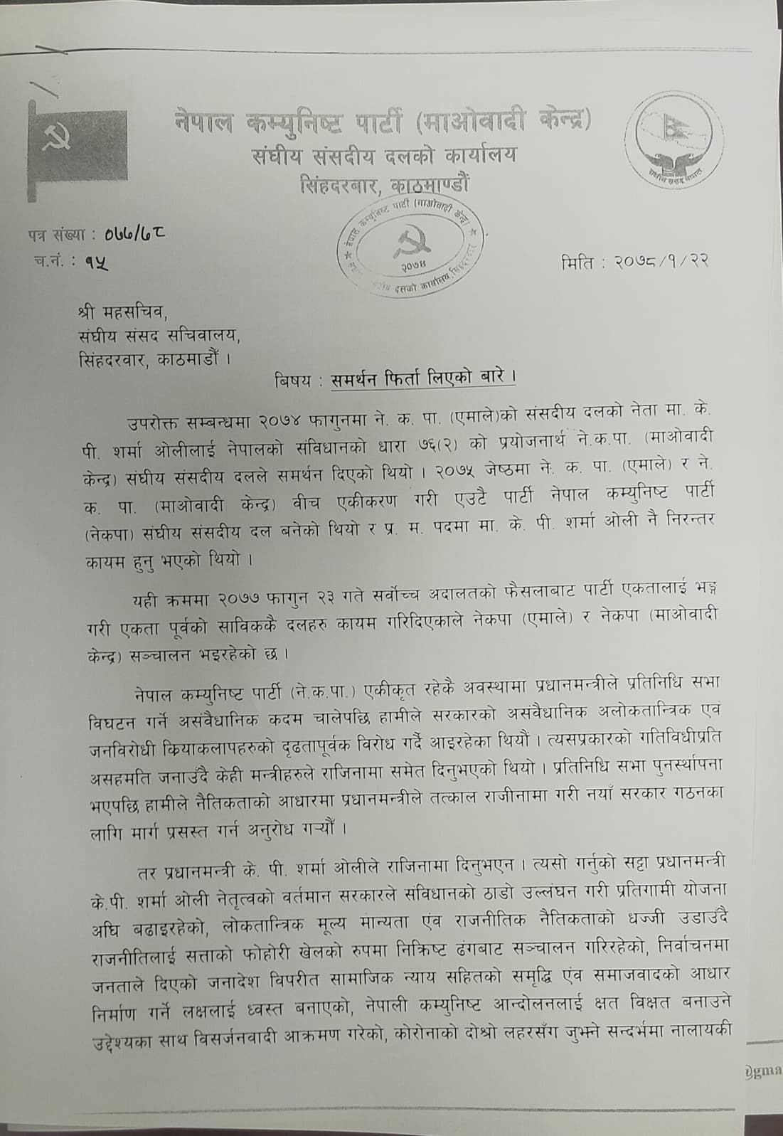 बुधबार माओवादी केन्द्रका प्रमुख सचेतक देव गुरुङले संसद सचिवालयका सचिव गोपालनाथ योगीलाई समर्थन फिर्ताको पत्र बुझाएका हुन् ।