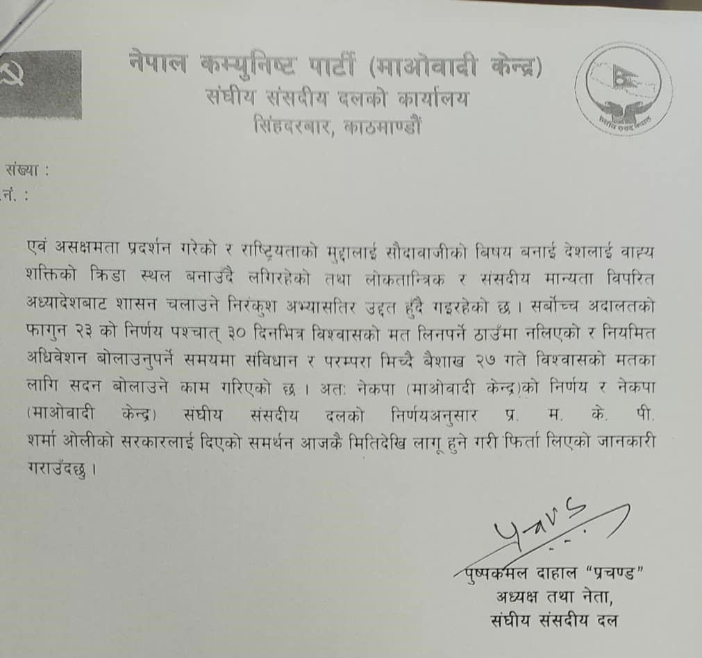 ‘सर्वोच्च अदालतको फागुन २३ को निर्णय पश्चात ३० दिनभित्र विश्वासको मत लिनुपर्ने ठाउँमा नलिएको र नियमित अधिवेशन बोलाउनुपर्ने समयमा संविधान र परम्परा मिच्दै वैशाख २७ गते विश्वासको मतका लागि सदन बोलाउने काम गरिएकाले माओवादी केन्द्रको निर्णय र नेकपा माओवादी संघीय संसदीय दलको निर्णयअनुसार प्रम केपी शर्मा ओलीको सरकारलाई दिएको समर्थन आजैका मितिदेखि लागु हुनेगरी फिर्ता लिएको जानकारी गराउँछु’, अध्यक्ष प्रचण्डले हस्ताक्षर गरेको समर्थन फिर्ता पत्रमा भनिएको छ ।