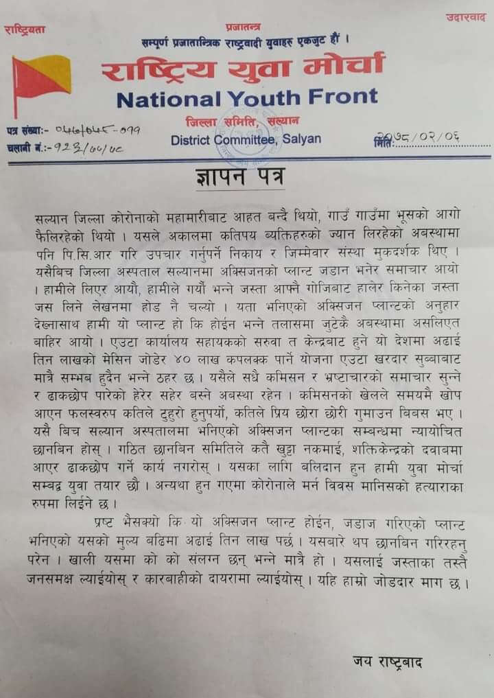 जेठ ०७, सल्यान । सल्यान अस्पतालमा भएको अक्सिजन प्लान्ट घोटाला प्रकरणमा संलग्न दोषिहरुलाई कारबाहीको माग गर्दै राप्रपा भातृ संगठन राष्ट्रिय युवा मोर्चा सल्यानले प्रमुख जिल्ला अधिकारी लक्ष्मिदेवि हुमागाई खतिवडालाई ज्ञापन पत्र बुझाएको छ ।