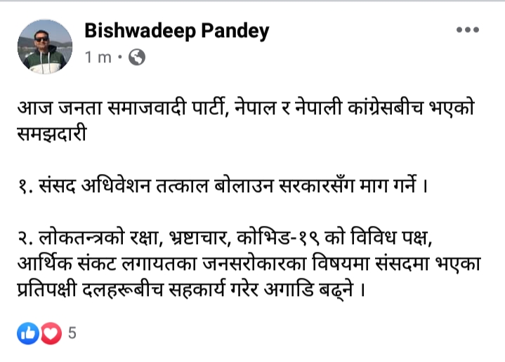 शनिबार दुई दलका शीर्ष नेताहरुले छलफल गरी तत्काल संसदको हिउँदे अधिवेशन बोलाउन सरकारसँग माग गर्ने निर्णय गरेका हुन् । छलफलमा कांग्रेसबाट सभापति देउवाको साथै वरिष्ठ नेता रामचन्द्र पौडेल र मिनेन्द्र रिजाल थिए भने जसपाबाट संघीय परिषद् अध्यक्ष डा. बाबुराम भट्टराई, केन्द्रीय समिति अध्यक्ष महन्थ ठाकुर र वरिष्ठ नेता राजेन्द्र महतो सहभागी भएका थिए ।