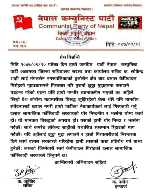 नेपाल कम्युनिस्ट पार्टी अछाम सेक्रेटरी अाखिर र इन्चार्ज नवीनले एक विज्ञप्ति जारी गर्दै शाहीलाई विना सर्त रिहाई गर्न माग गरेका छन ।