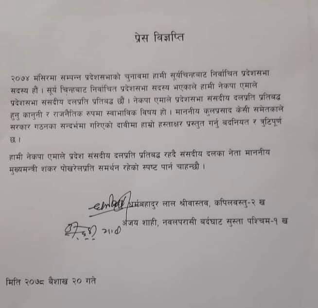 तर सोमबार संयुक्त वक्तव्य जारी गर्दै उनीहरुले आफूहरुको समर्थन मुख्यमन्त्री पोखरेललाई रहेको बताएका छन् । आफूहरु एमाले संसदीय दलप्रति प्रतिवद्ध रहेको भन्दै उनीहरुले भनेका छन्, माननीय कुलप्रसाद केसी समेतले सरकार गठनका सन्दर्भमा गरिएको दाबीमा हाम्रो हस्ताक्षर प्रस्तुत गर्नु बदनियत र त्रुटिपूर्ण छ ।’
