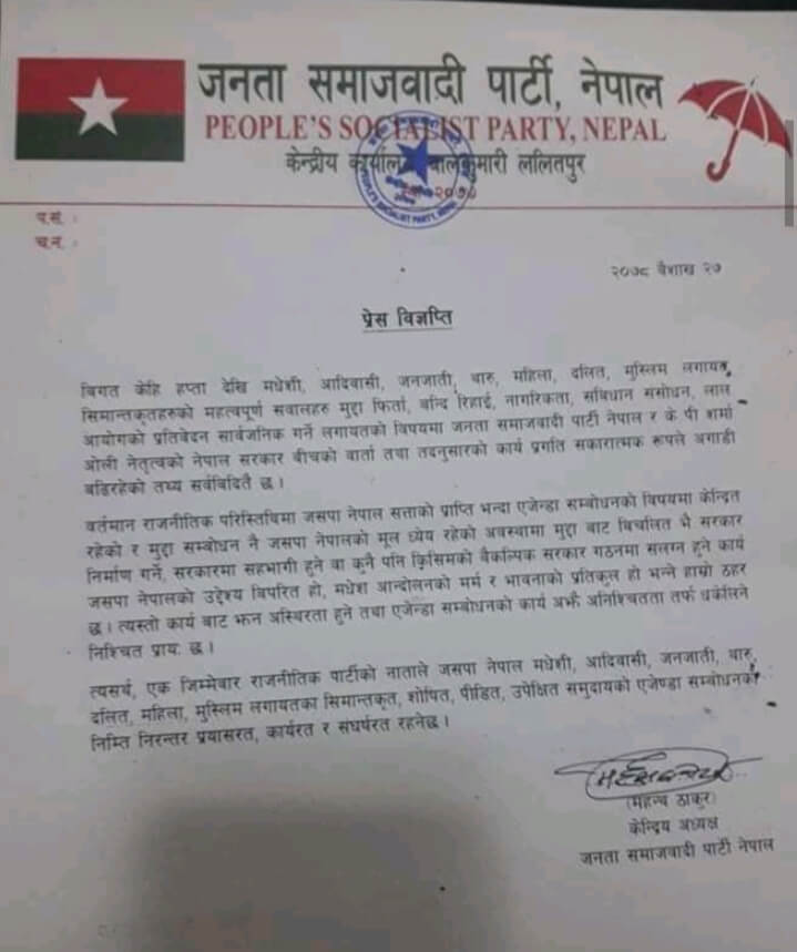साेमबार राती विज्ञप्ति जारी गर्दै ठाकुरले जसपा नेपाल सत्ता प्राप्तिभन्दा एजेण्डा सम्बाेधनकाे विषयमा केन्द्रीत रहेको बताएका हुन् । तर उनैका पार्टीका अर्का अध्यक्ष उपेन्द्र यादवले नया सरकार गठनका लागि सोमबार नै आह्वान गरिसकेका छन् । संसदमा प्रधानमन्त्रीको विस्वासको मतमा विपक्षमा मतदान गरेका उनको समुहले कांग्रेस माओवादी गथाबंधना संग मिलेर केपी ओलीको विपक्षमा वैकल्पिक सरकार बनाउन आह्वान गरेन राष्ट्रपति लाई संयुक्त वक्तव्य मार्फत अपिल गरेका थिए ।