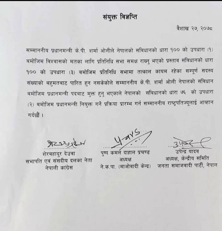लगतै नेपाली कांग्रेस सभापति शेरबहादुर देउवा, माओवादी केन्द्रका अध्यक्ष पुष्पकमल दाहाल प्रचण्ड र जसपा अध्यक्ष उपेन्द्र यादवले संयुक्त वक्तव्य जारी गर्दै संविधानको धारा ७६(२) अनुसार प्रधानमन्त्री नियुक्त गर्ने प्रक्रिया सुरु गर्न राष्ट्रपतिलाई आग्रह गरेका थिए । सरकार बनाउन बहुमत पुगने उनीहरुको दाबी छ । नयाँ सरकार गठनको पक्षमा कांग्रेसका ६१, माओवादी केन्द्रका ४९ सांसद छन् भने जसपाको डा. बाबुराम भट्टराई-उपेन्द्र यादव पक्षका १६ सांसद देखिएका छन् । २७१ सदस्यीय प्रतिनिधिसभामा बहुमतका लागि १३६ सांसद चाहिन्छ ।