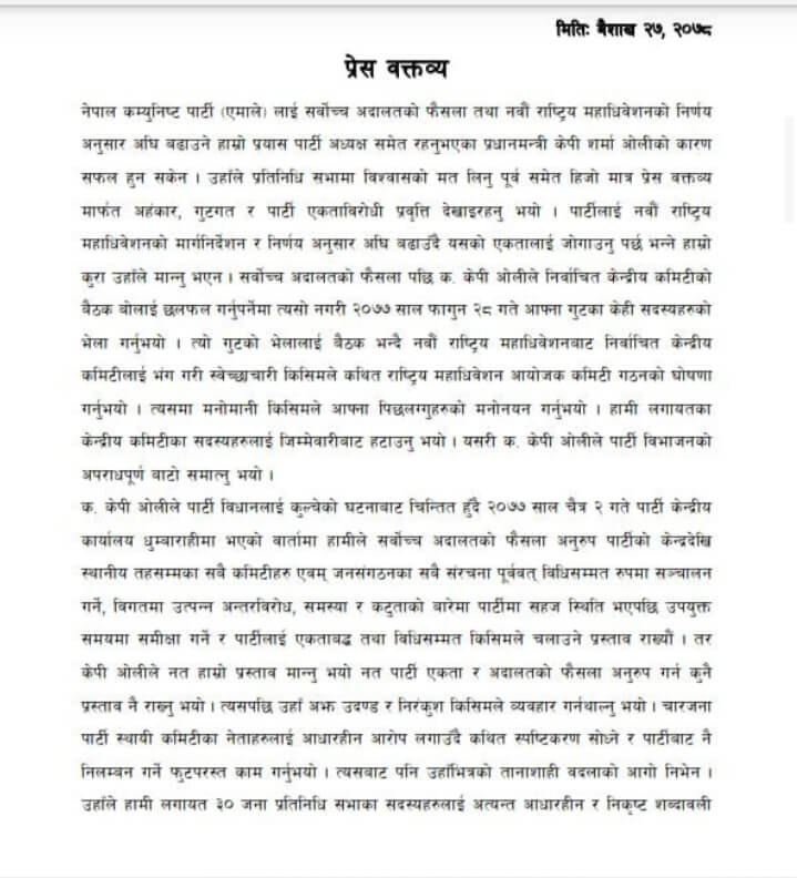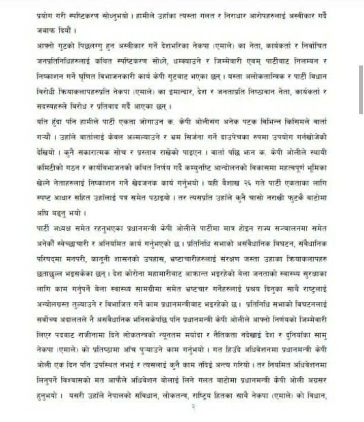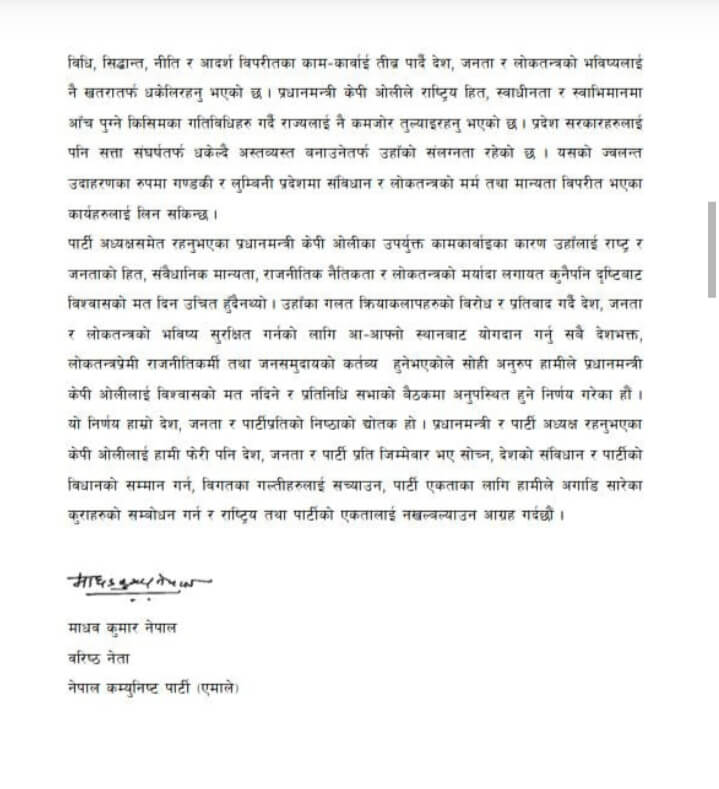 नेपालले सोमबार साँझ तीन पेज लामो प्रेस विज्ञिप्त जारी गर्दै ओलीका गलत क्रियाकलापहरुको विरोध र प्रतिवाद गर्दै देश, जनता र लोकतन्त्रको भविष्य सुरक्षित गर्न आफूहरुले विश्वासको मत नदिने र प्रतिनिधि सभाको बैठकमा अनुपस्थित हुने निर्णय गरेको बताएका छन् ।
