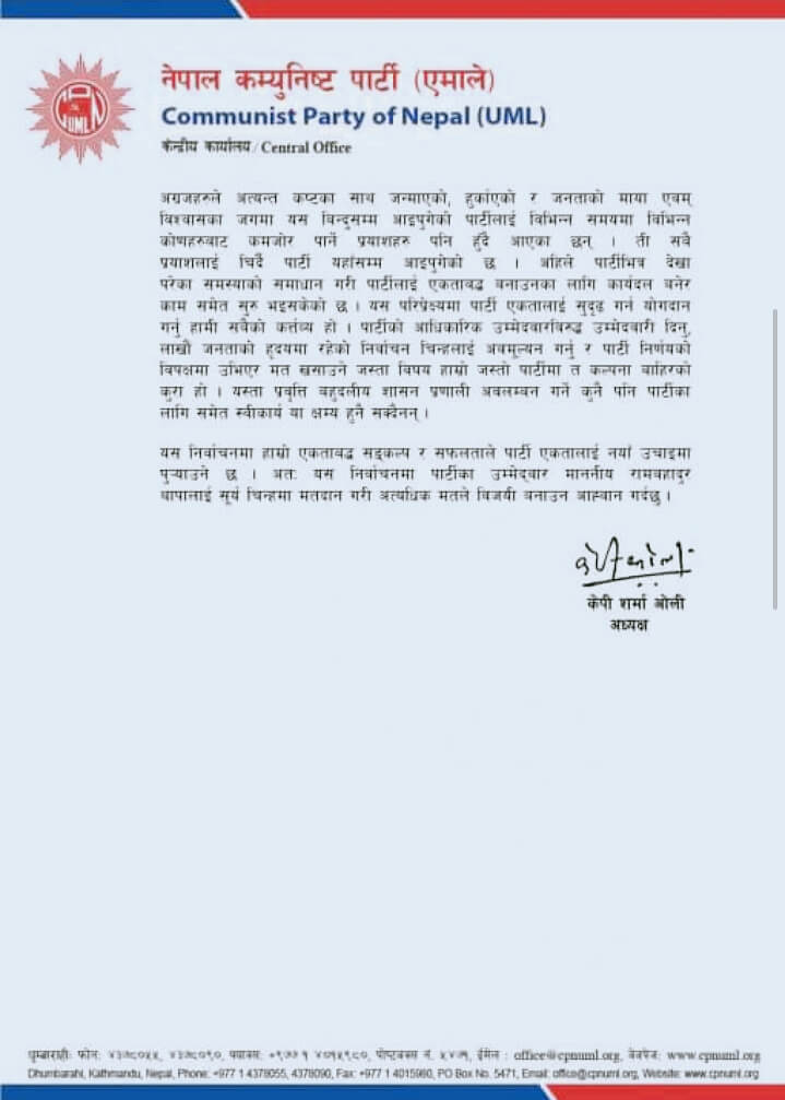 ‘यस निर्वाचनमा हाम्रो एकताबद्ध सङ्कल्प र सफलताले पार्टी एकतालाई नयाँ उचाइमा पुर्‍याउने छ। अतः यस निर्वाचनमा पार्टीका उम्मेद्वार माननीय रामबहादुर थापालाई सूर्य चिन्हमा मतदान गरी अत्यधिक मतले विजयी बनाउन आह्वान गर्दछु’, ओलीले भनेका छन्।