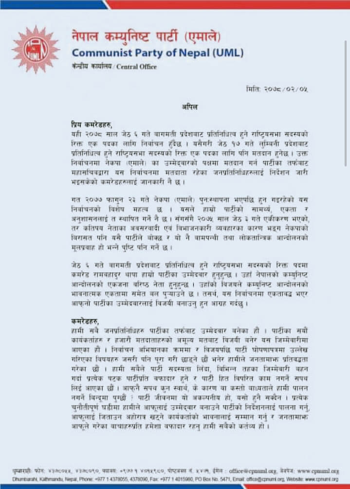 ‘जेठ ६ गते वागमती प्रदेशबाट प्रतिनिधित्व हुने राष्ट्रियसभा सदस्यको रिक्त पदमा कमरेड रामबहादुर थापा हाम्रो पार्टीका उम्मेदवार हुनुहुन्छ । उहाँ नेपालको कम्युनिष्ट आन्दोलनको एकजना वरिष्ठ नेता हुनुहुन्छ । उहाँको विजयले कम्युनिष्ट आन्दोलनको भावनात्मक एकतामा समेत बल पुर्‍याउने छ । तसर्थ, यस निर्वाचनमा एकतावद्ध भएर आफ्नो पार्टीका उम्मेदवारलाई विजयी बनाउनु हुन आग्रह गर्दछु’, ओलीले अपीलमा भनेका छन्।